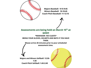 Note: If your player is registered for tee ball, there is no assessment. Players will be placed on rosters shortly after 3/15, and team managers will start reaching out by the following week.